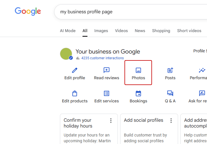 Each week, take 10 photos of your business (inside and out) and upload those as "posts" via your Google Business Profile.